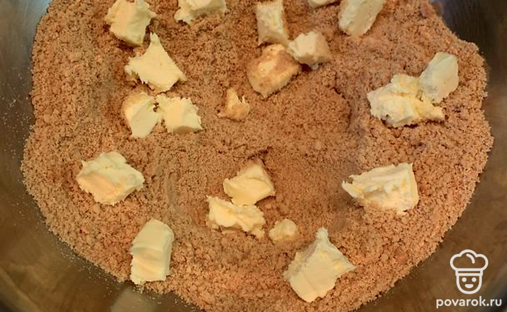 Песочное печенье тщательно измельчите в крошку. Добавьте нарезанное на куски сливочное масло.