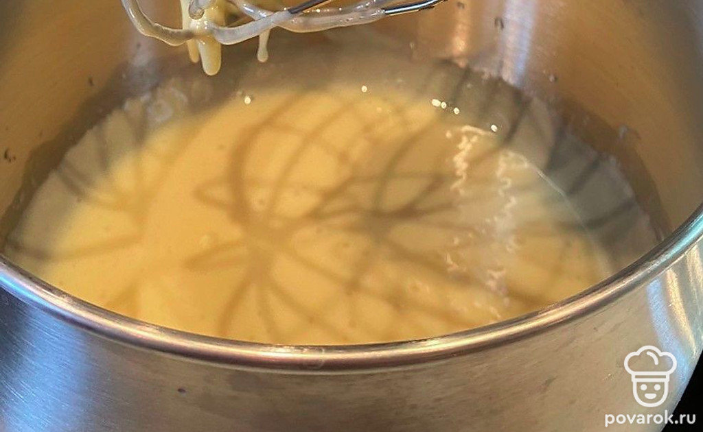 Приготовьте начинку. Взбейте 3 желтка венчиком либо миксером или блендером на средней скорости. Добавьте сгущенное молоко и снова перемешайте. Пока сгущенное молоко и желтки смешиваются до однородной массы, постепенно добавьте лимонный сок, выжатый из половины лимона.