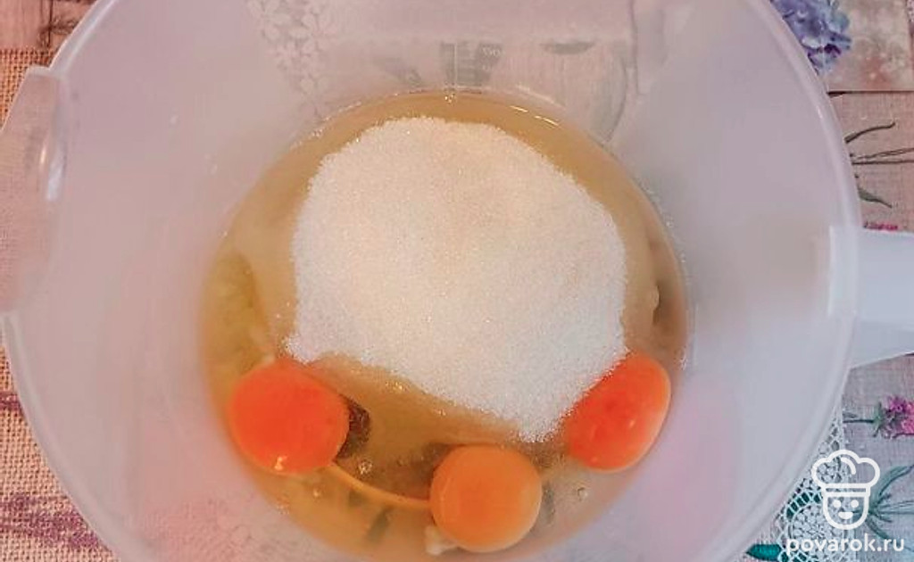 В яйца добавьте 180 граммов сахара. Хорошо перемешайте венчиком.