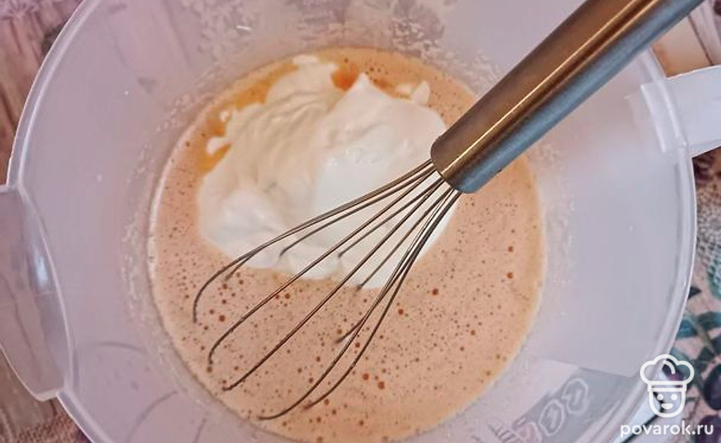 В яичную смесь добавьте сметану и хорошо перемешайте.
