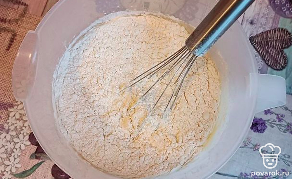 Далее добавьте муку и разрыхлитель. Снова перемешайте, чтобы не было комочков.