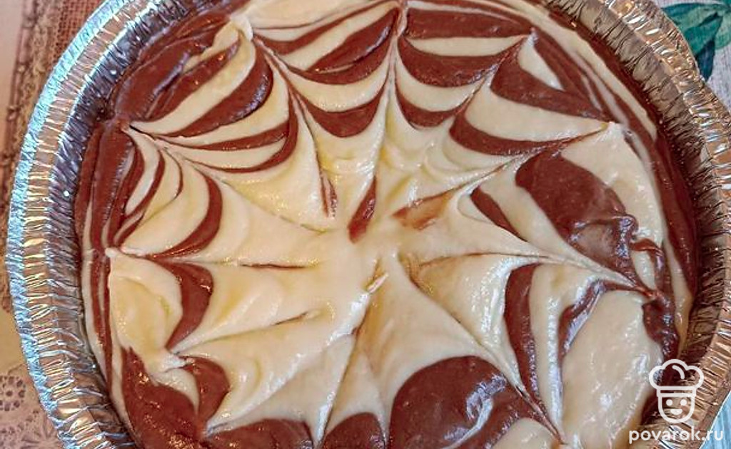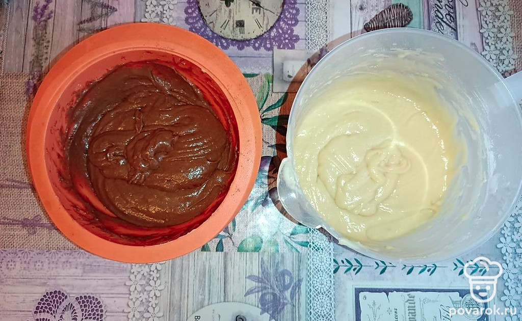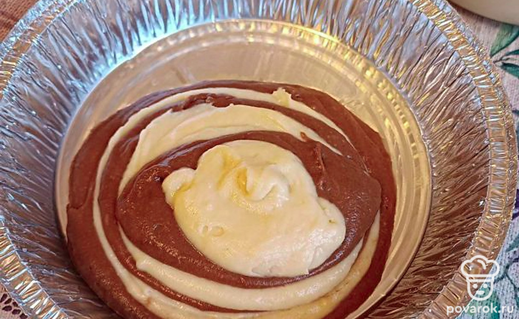 В форму выложите тесто. Выкладывайте тесто по очереди (белое, коричневое и так далее).