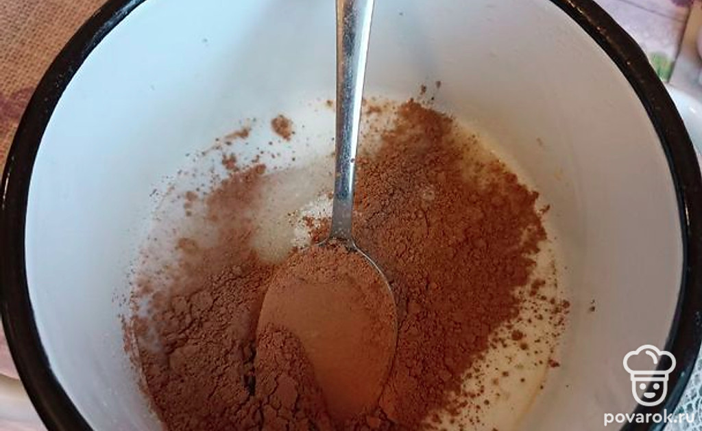 Соедините 100 граммов сахара, 2 столовых ложки какао и 3 столовых ложки молока. Перемешайте, варите на среднем огне до растворения сахара.