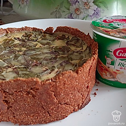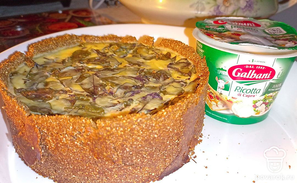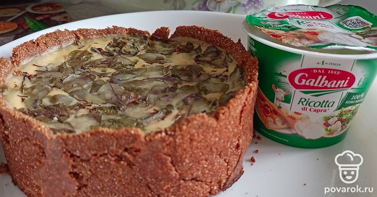 Несладкое гречневое песочное тесто на сметане с начинкой из козьей рикотты, козьим молоком, яйцами и базиликом.