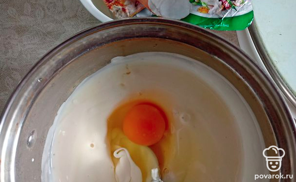 Пока подпекается форма, приготовьте начинку из баночки козьей рикотты, 3 яиц, 5 грамм кукурузного крахмала.
