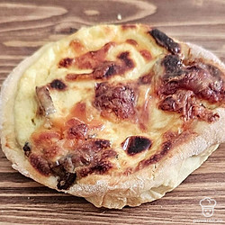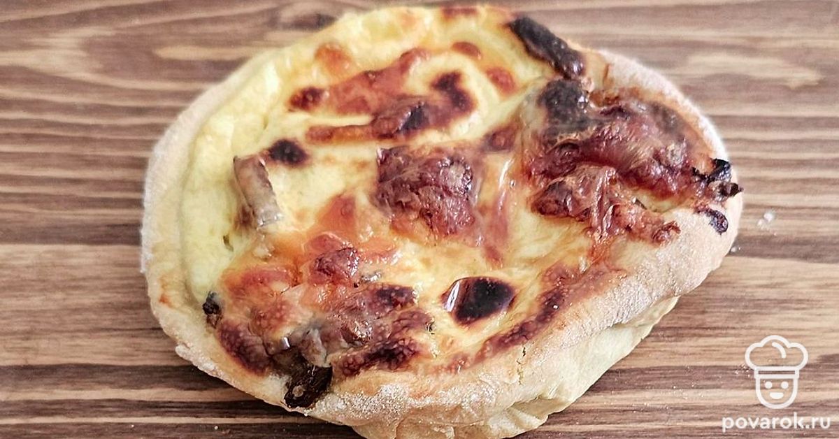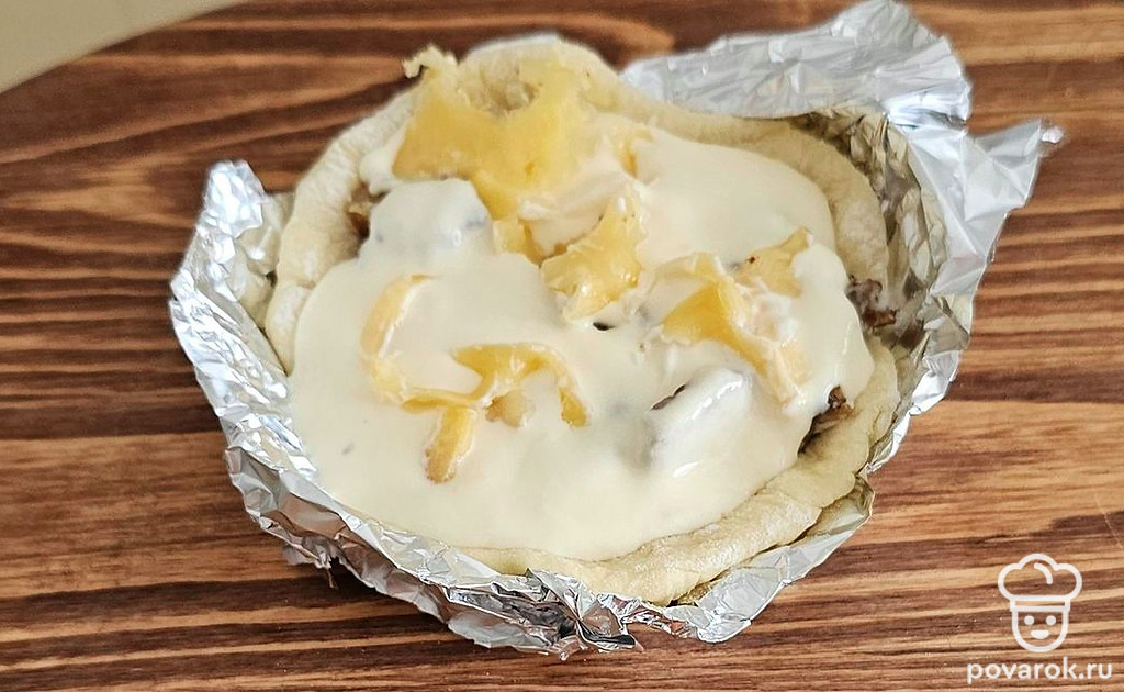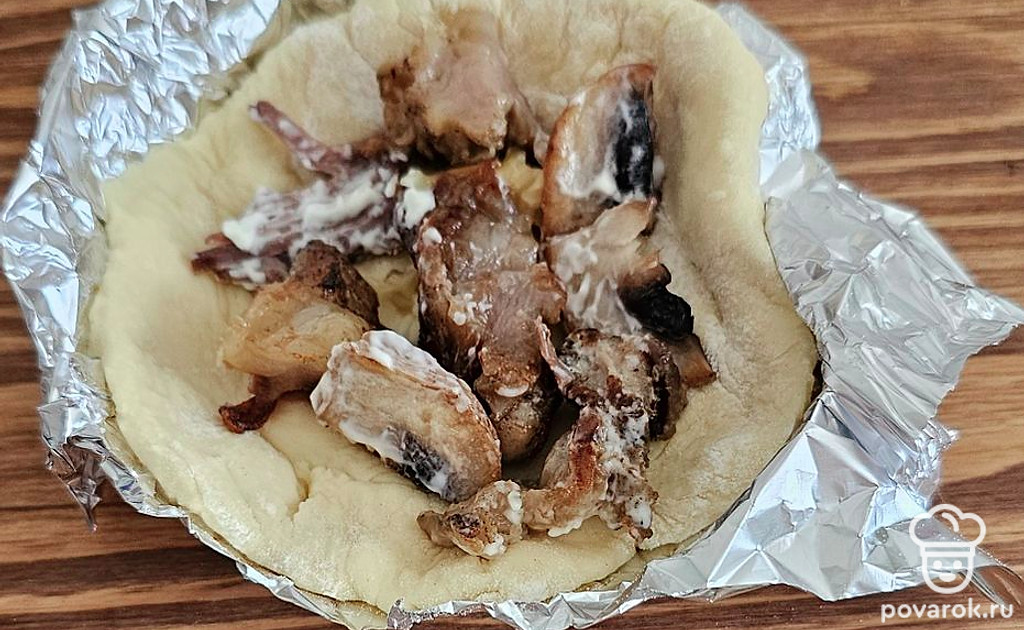На растительном масле обжарьте грибы с тушенкой минут 5. Из фольги сделайте круг и выложите тесло, а на него тушенку с грибами.