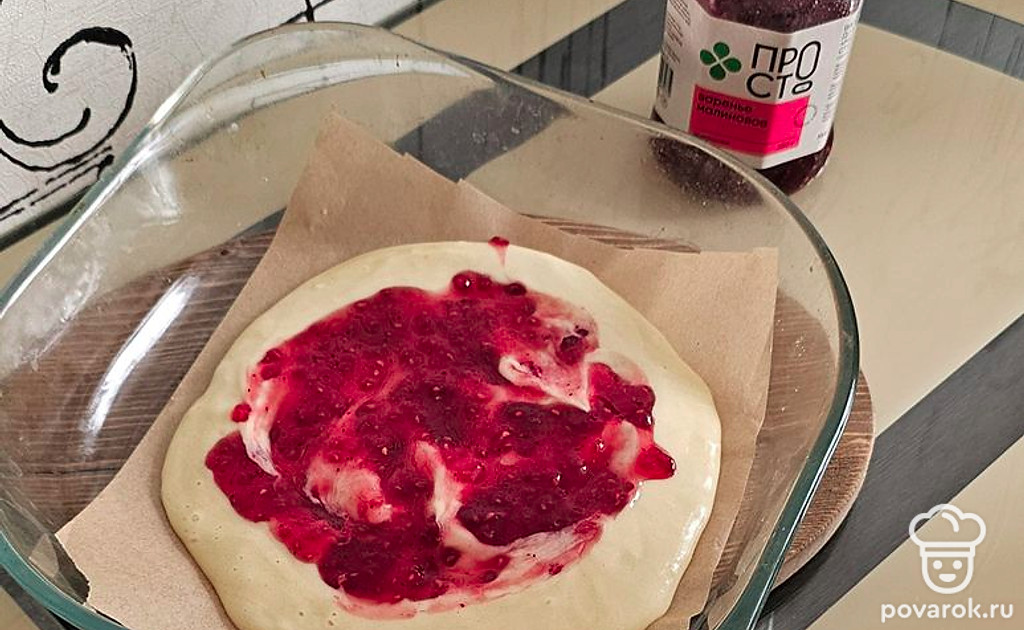 Форму для выпечки застелите бумагой, вылейте часть теста, сверху выложите варенье.