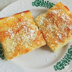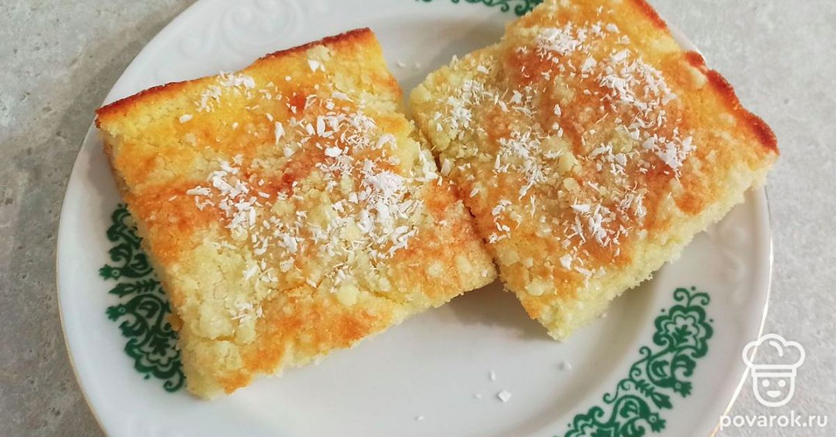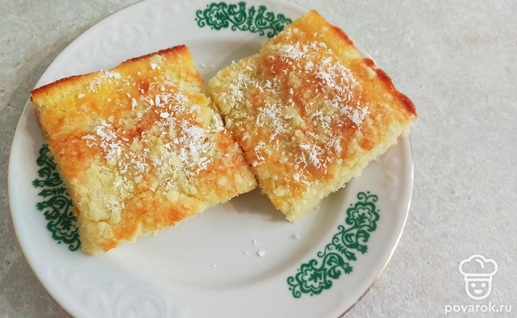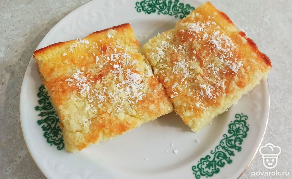 Нарежьте пирог и посыпьте кокосовой стружкой.