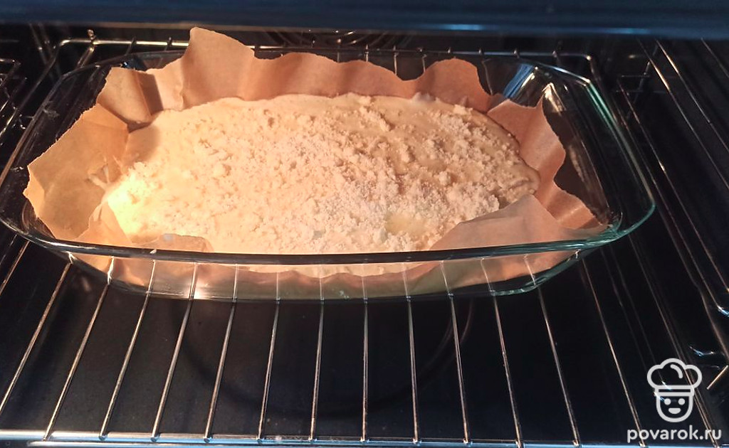 Вылейте тесто в форму для запекания, посыпьте крошкой и поставьте в разогретую до 180 градусов духовку на 30 минут.