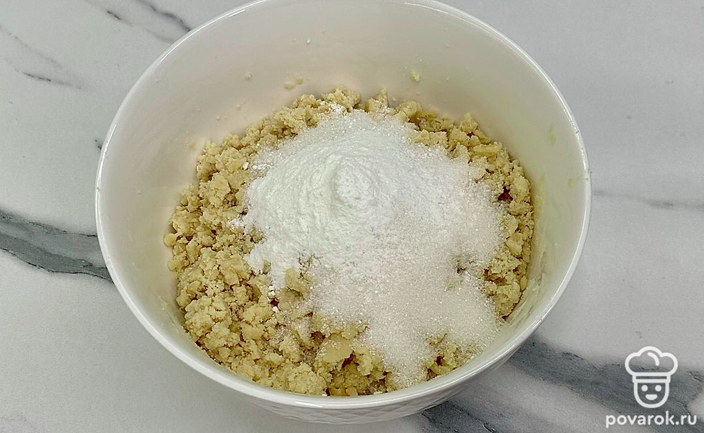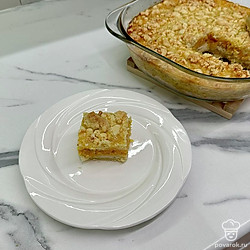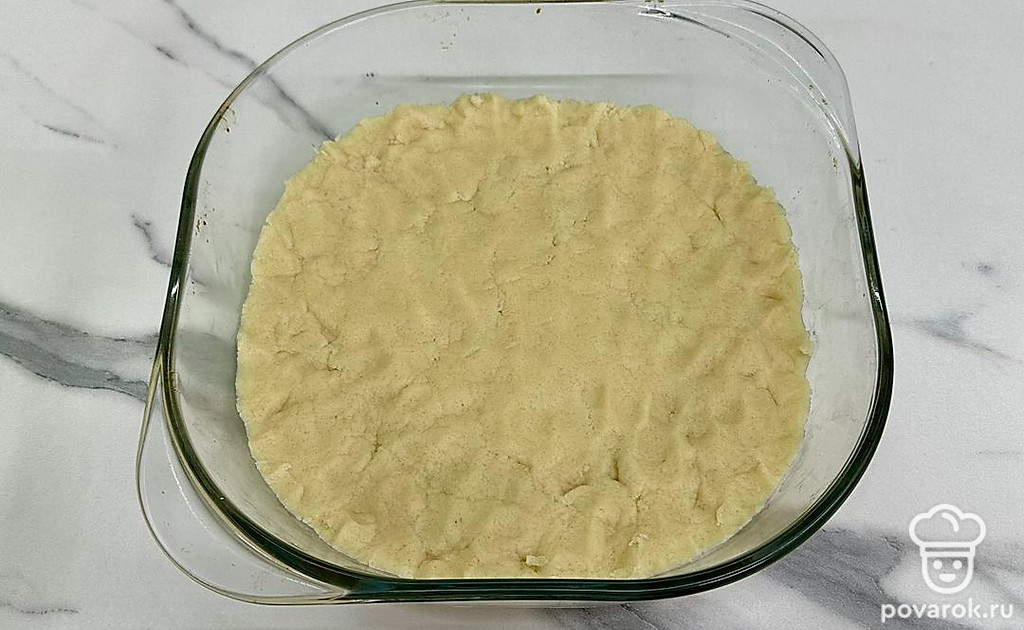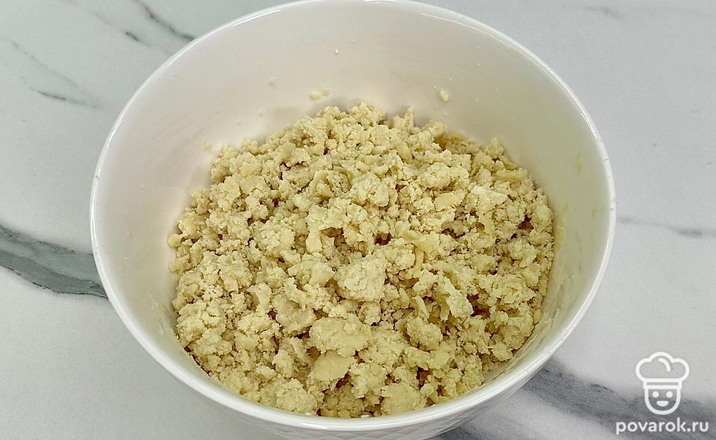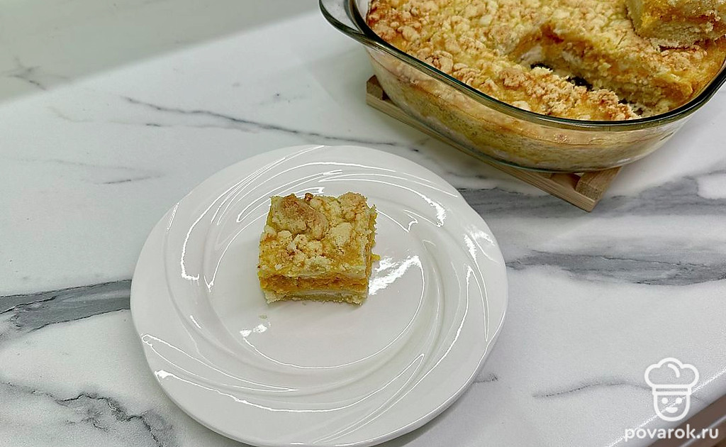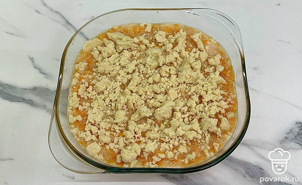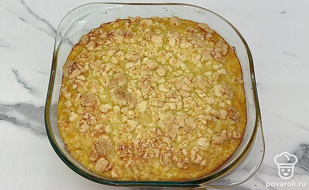 Сверху посыпать оставшимся тестом. Отправить в разогретую до 180 градусов духовку примерно на 1 час. Важно следить за корочкой, пирог должен стать румяным.