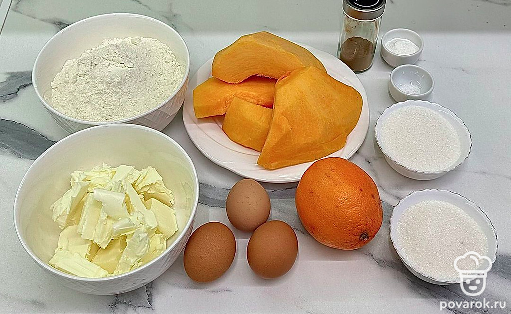 Подготовить все ингредиенты. Тыкву очистить от кожуры и семян. Муку просеять, масло нарезать небольшими кусочками.