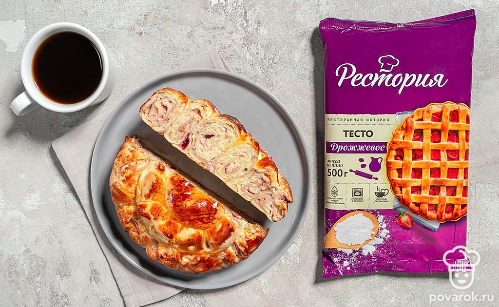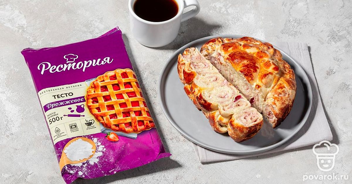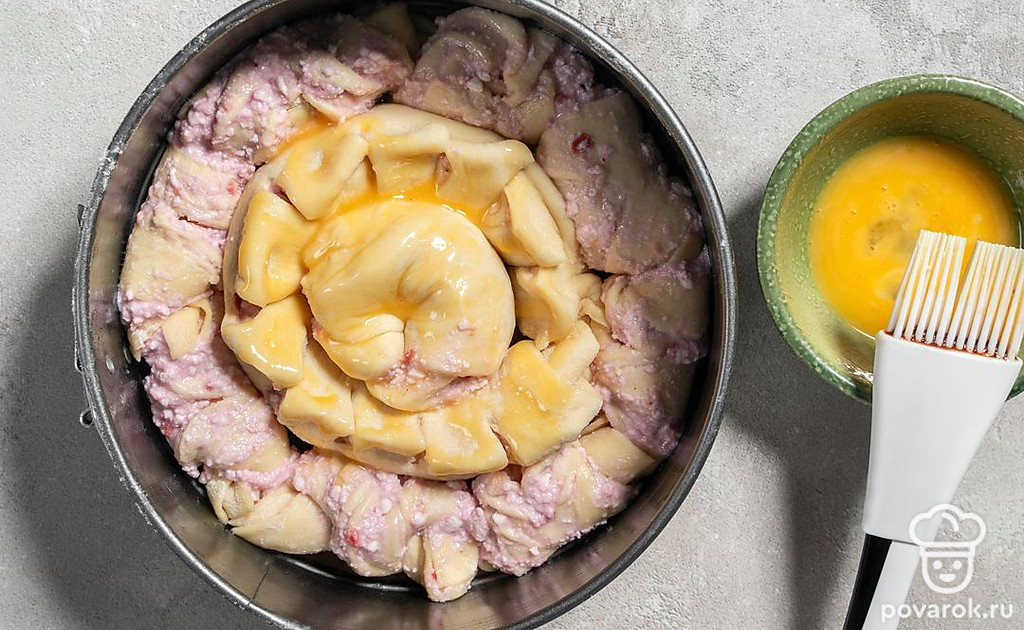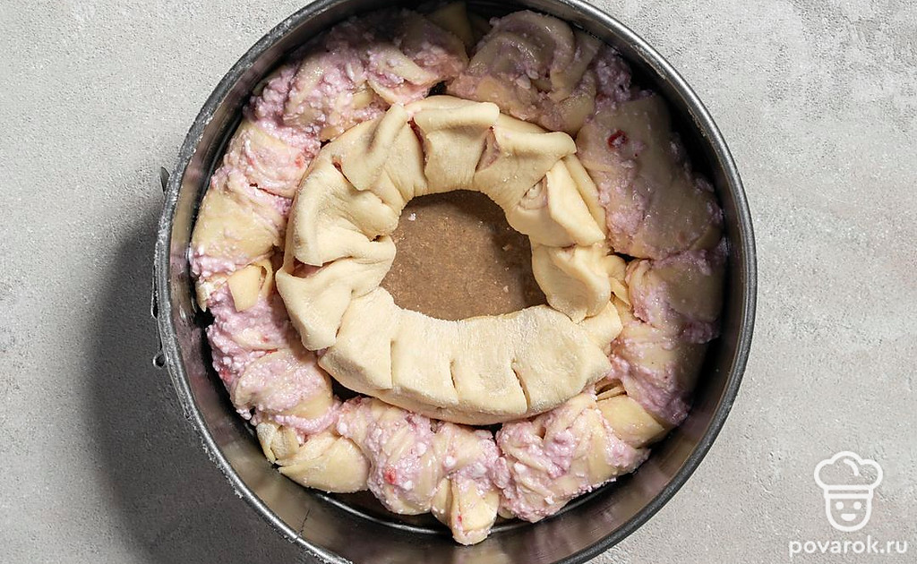 Оставшееся тесто раскатайте в тонкий пласт, смажьте начинкой и так же сверните в рулет. Этот рулет скрутите жгутом и положите в центр формы. Смажьте пирог желтком и отправьте в разогретую до 180°C духовку на 25 минут.
