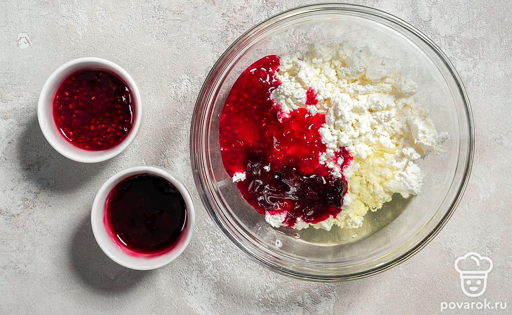 Отделите куриный белок от желтка. В миске смешайте творог с белком, вишневым и малиновым вареньем.