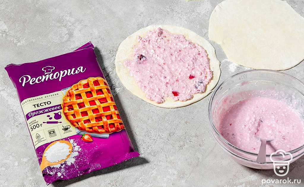 Возьмите половину теста и разделите его на 3 части. Каждую часть раскатайте в тонкий пласт и вырежьте одинаковые большие круги из каждого пласта. Теперь каждый круг смажьте начинкой и положите друга на друга. Верхний круг теста не смазывайте начинкой.