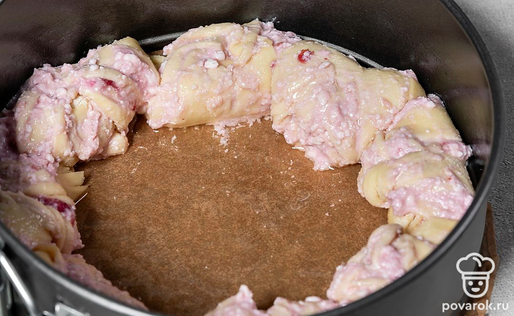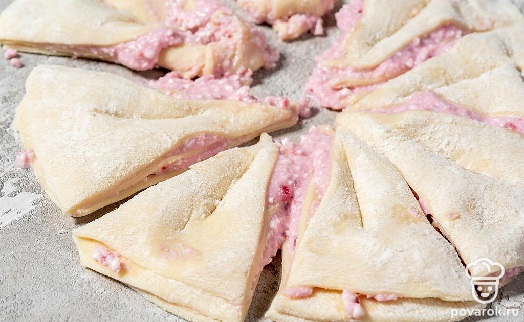 Разрежьте получившийся пирог на 8 треугольников. В каждом треугольнике по центру сделайте надрез, угол проверните через этот надрез 2 раза. Потом широкую часть треугольника скрутите к узкой.