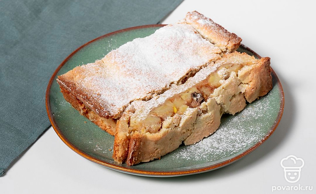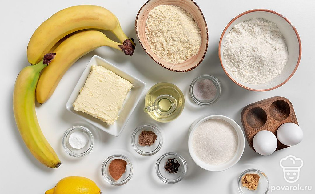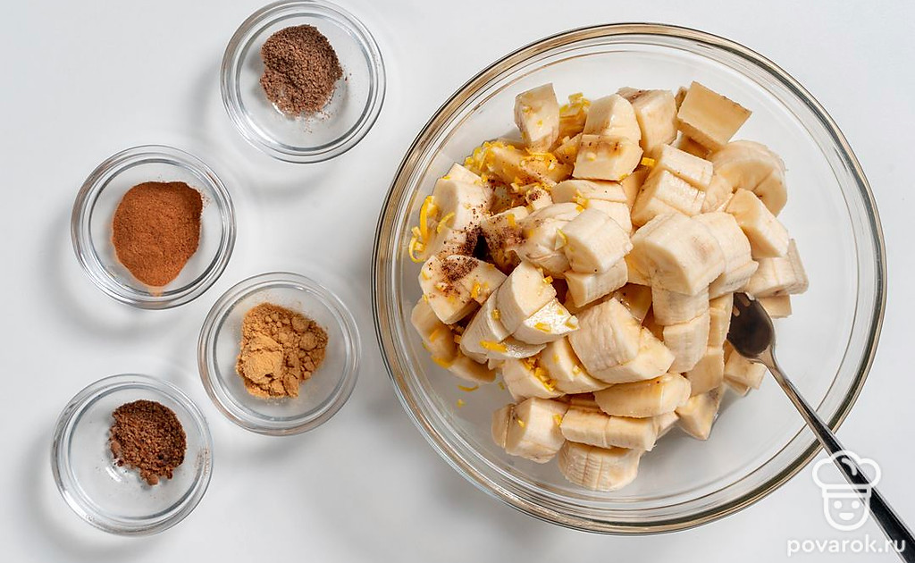 Для начинки этого пирога сладкие бананы мы смешали с ароматными специями: корицей, гвоздикой, молотым имбирем и мускатным орехом. И еще добавили немного лимонной цедры. Сладость самих бананов зависит от их спелости. Чем темнее кожура, тем вкуснее банан. Тесто приготовлено на основе двух видов муки: пшеничной и кукурузной. Для тех, кто придерживается принципов правильного питания, рекомендуем пшеничную муку полностью заменить на безглютеновую. И отказаться от сахара в пользу меда или стевии.