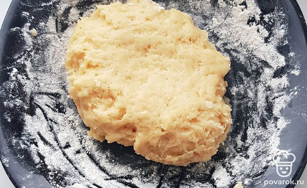 Размягчаем масло, добавляем сахар (80 граммов), яйцо (1 штука), муку и разрыхлитель. Замешиваем тесто.