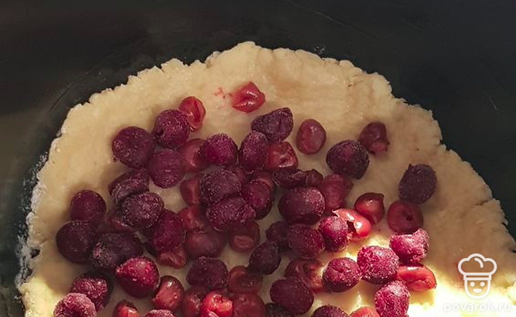 Раскатываем тесто и перекладываем в форму. Выкладываем вишню.