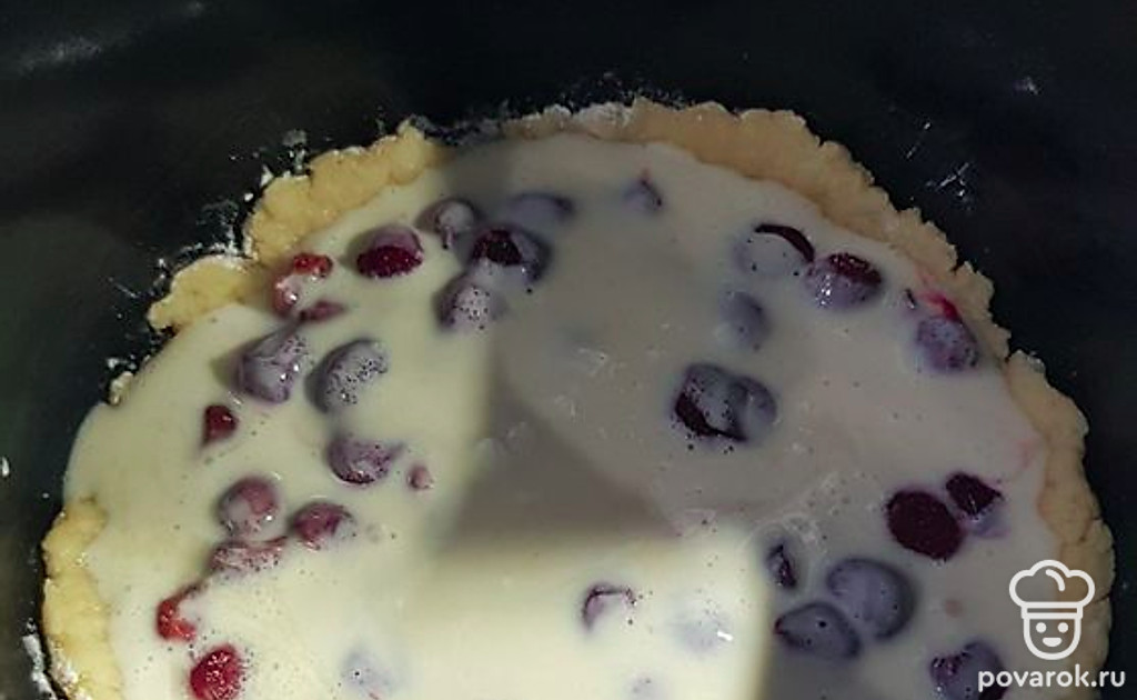 Яйца (2 штуки), сметану и сахар (80 граммов) смешиваем и выливаем на вишню.