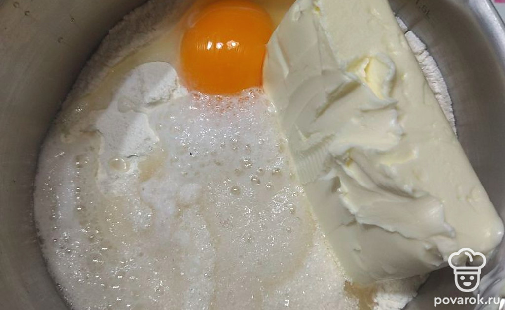 Приготовить песочное тесто. Смешать муку, сливочное масло, 1 яйцо, разрыхлитель.