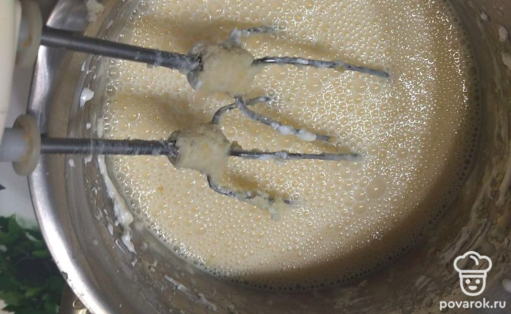 Взбить сметану с 3 яйцами, 100 граммами сахара и ванилином.