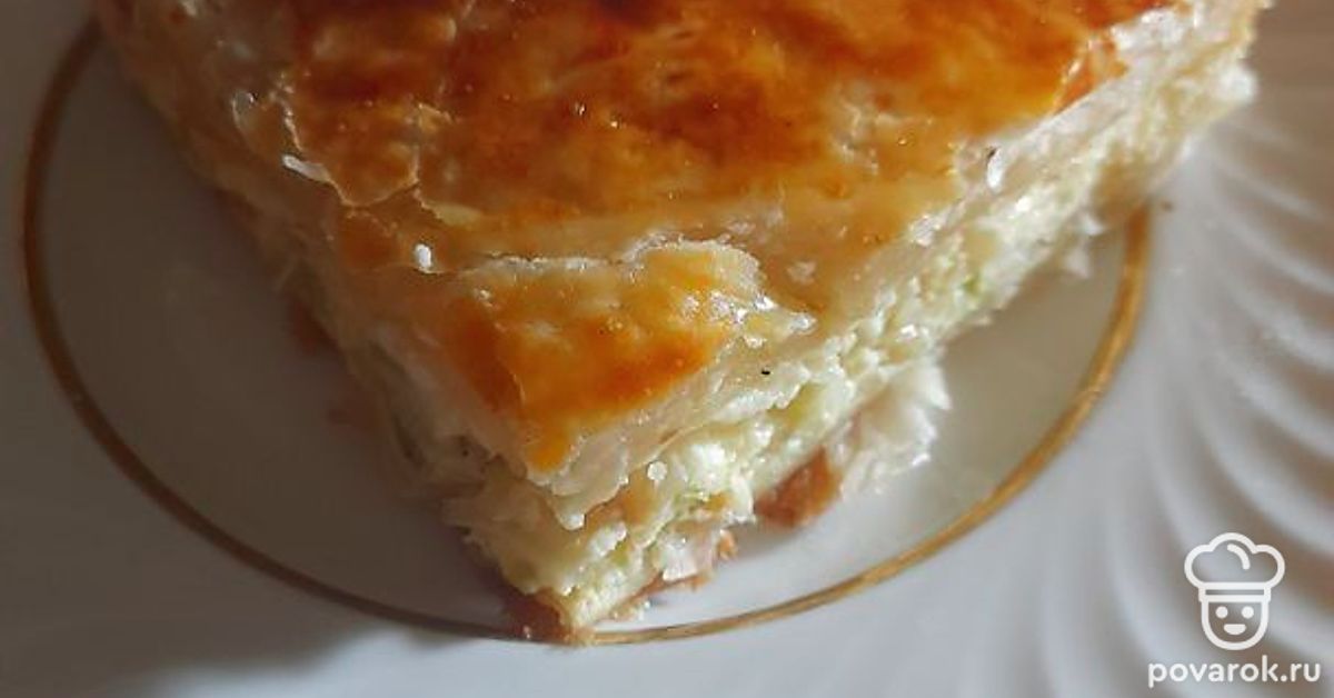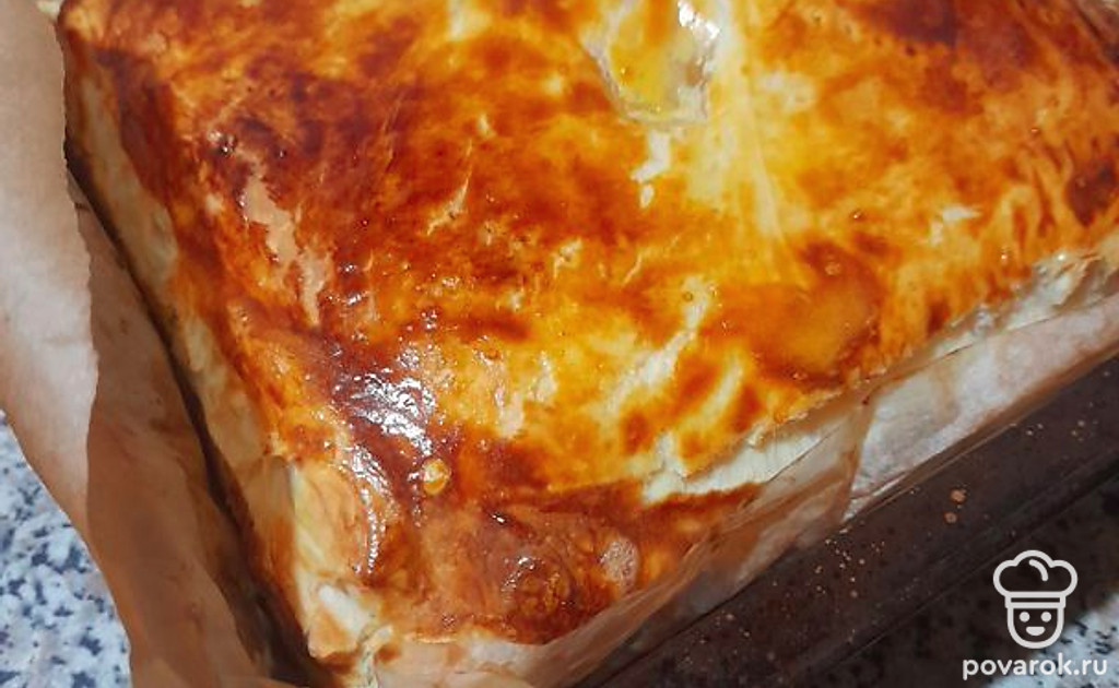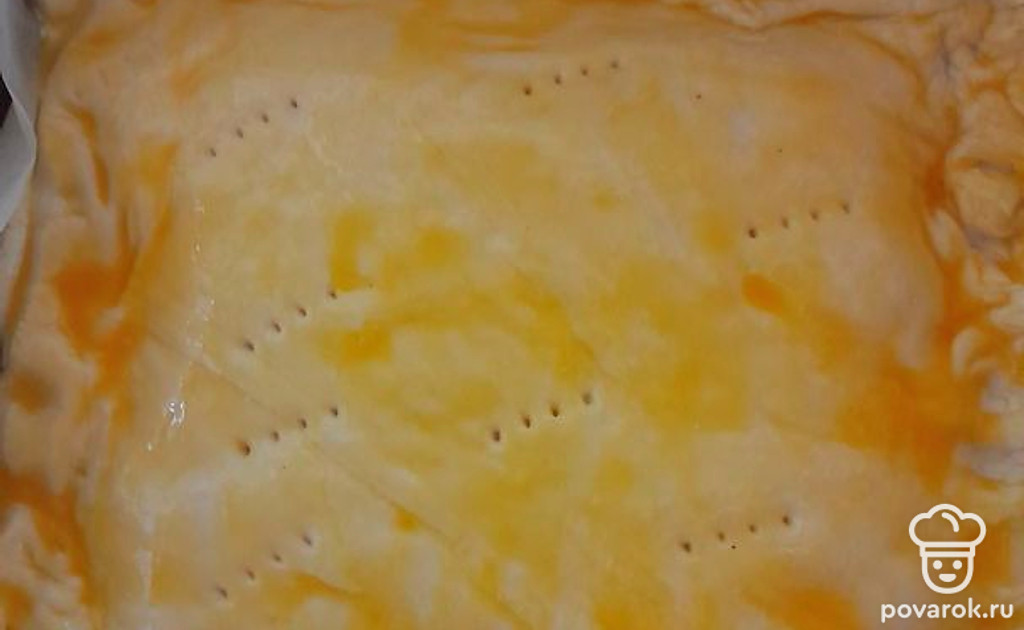 В форму для запекания выкладываем лист пергамента, на него кладем половину упаковки бездрожжевого готового теста, делаем небольшие бортики и выливаем нашу начинку. Сверху закрываем второй частью теста, края скрепляем между собой, чтобы начинка не вытекла. Делаем проколы вилкой и смазываем яйцом.