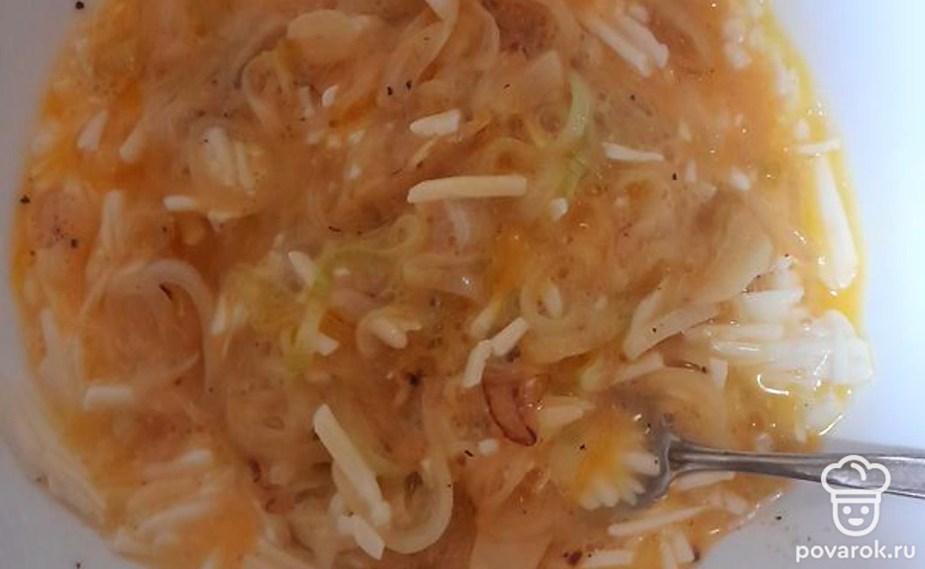 В миске соединяем обжаренный лук, натертый плавленый сыр, 2 сырых куриных яйца, соль и перец по вкусу.