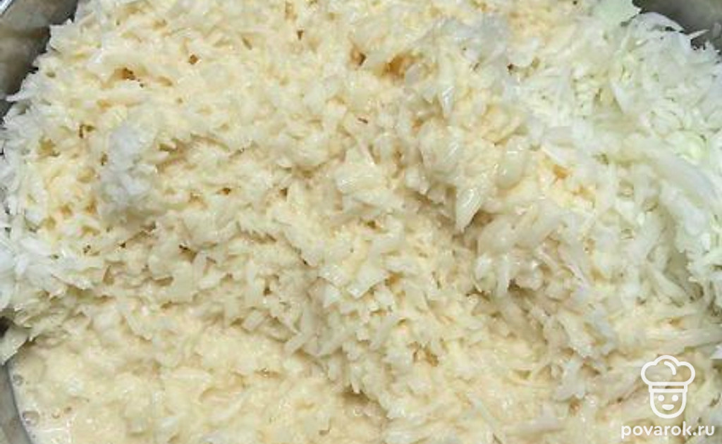 Полученную смесь добавляем в капусту и тщательно перемешиваем.