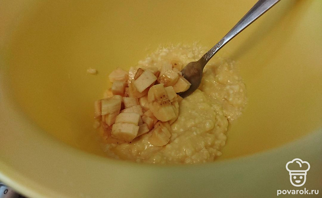 Банан помойте, очистите и нарежьте мелкими кусочками. Все размешайте.