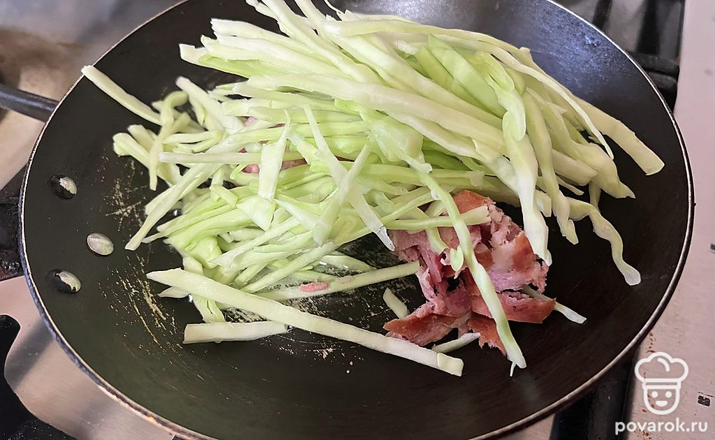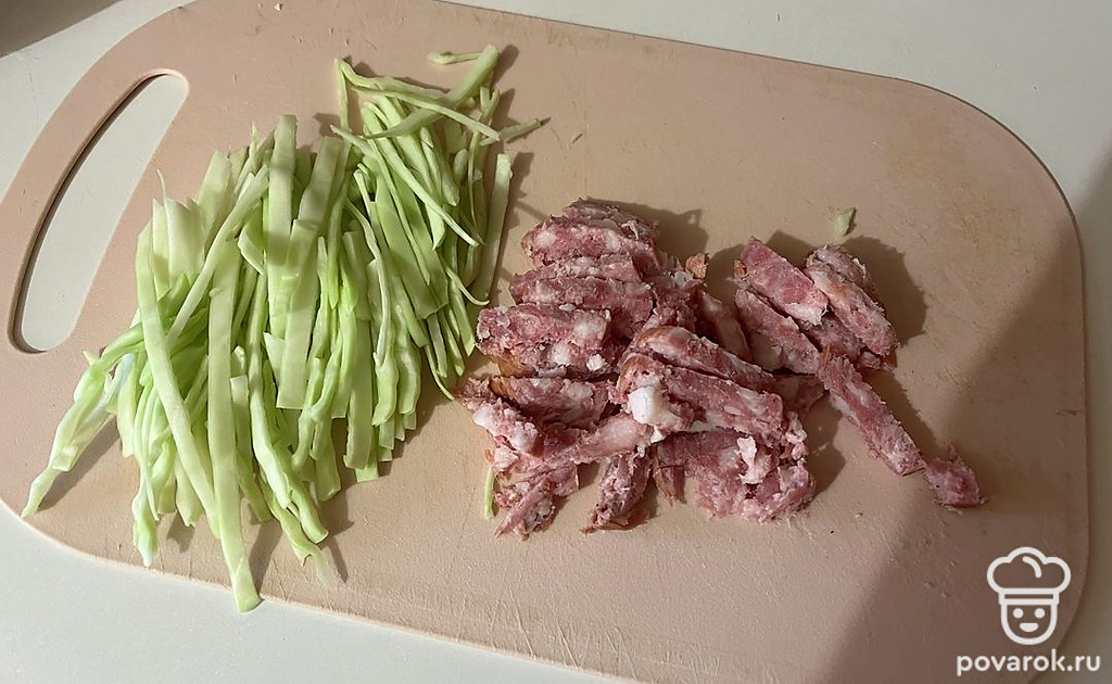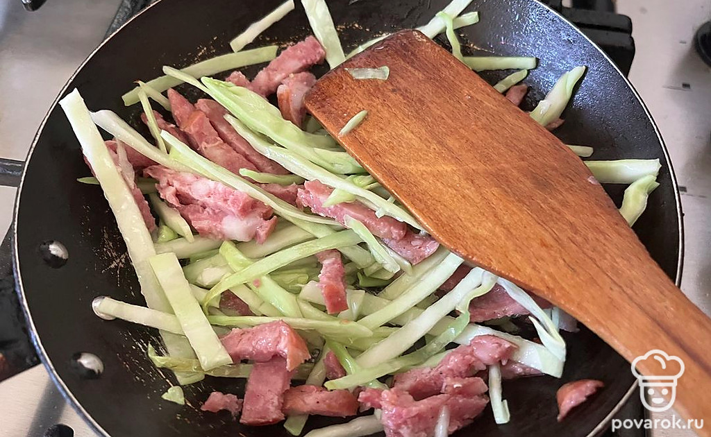 В раскаленное масло поместите колбасу, капусту, перец и соль.
