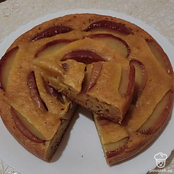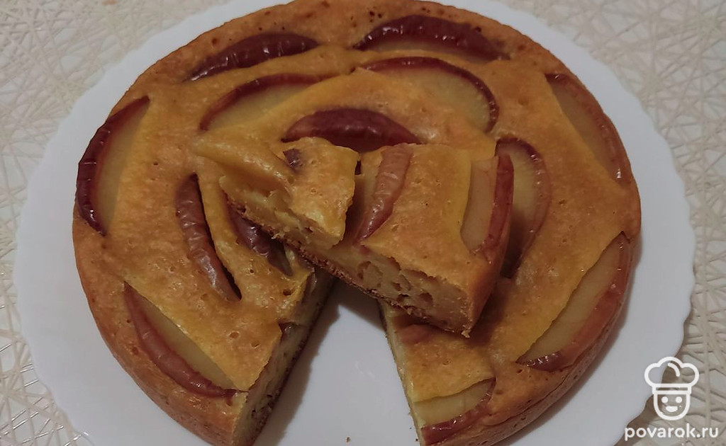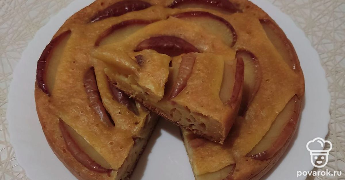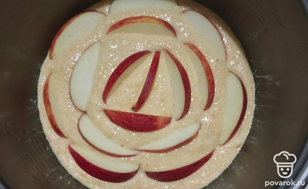 Нарежем яблоко. Тесто выльем в форму для выпечки, сверху положим нарезанные яблоки. Поставим в разогретую до 180 градусов духовку и будем выпекать пирог около 45 минут.