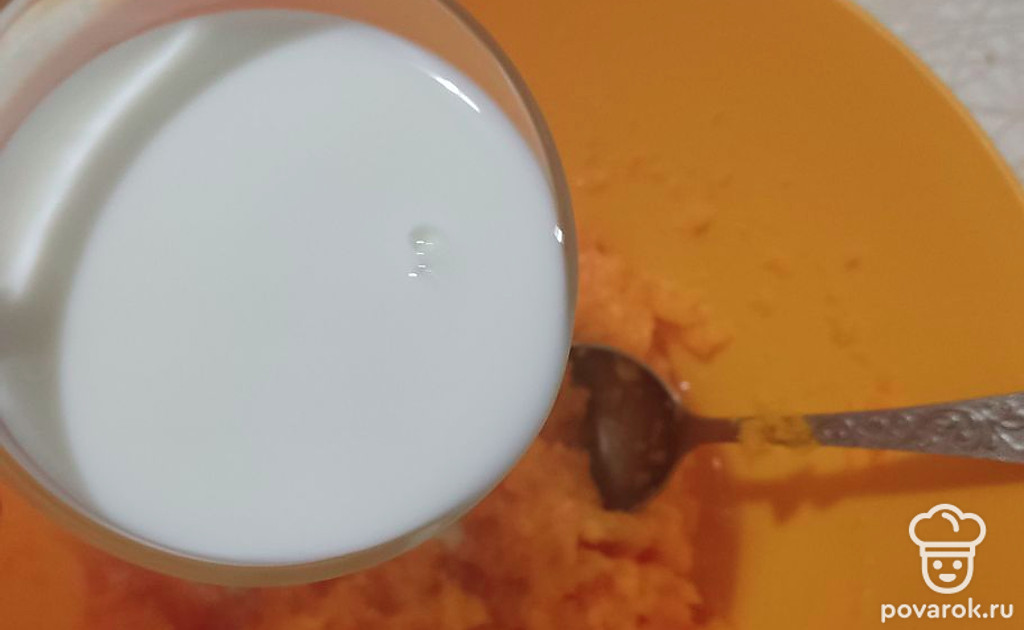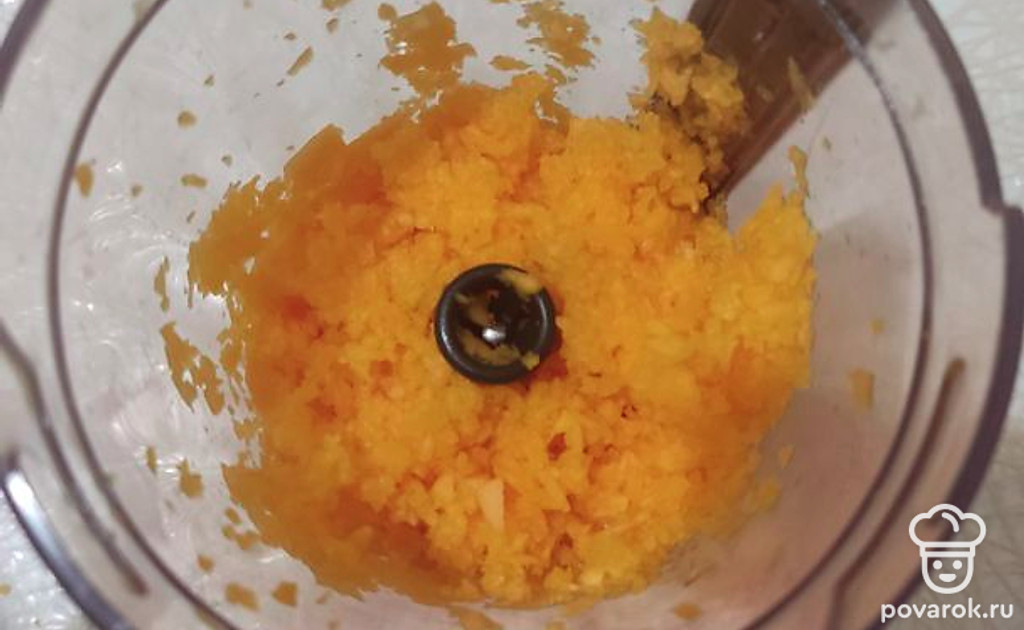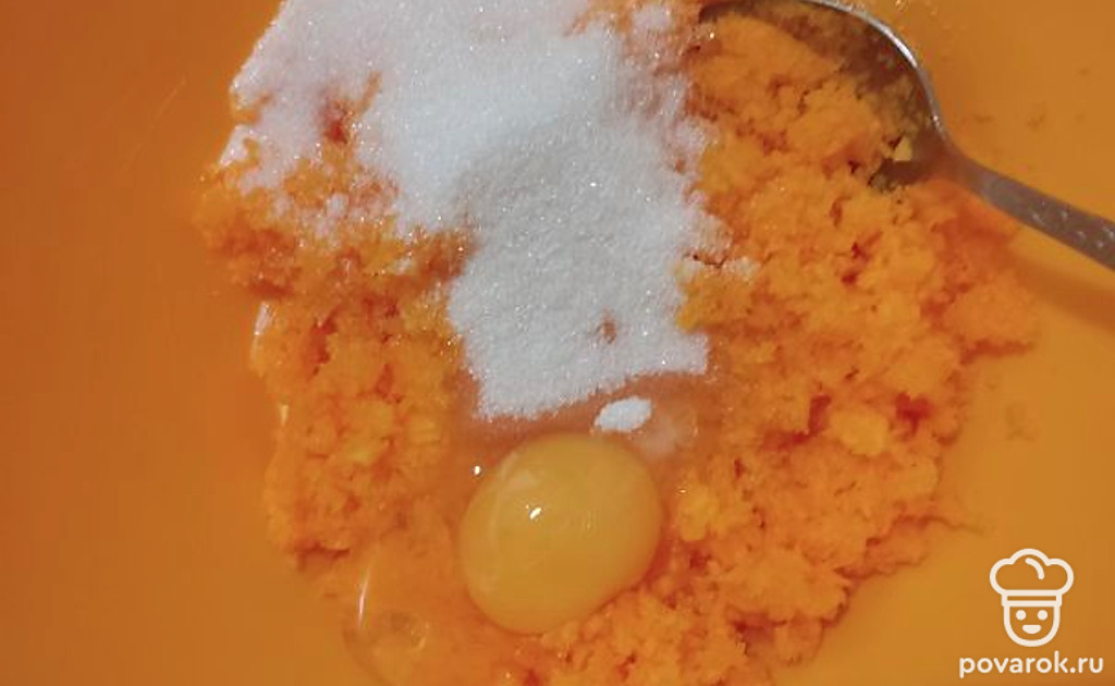 Выложим в глубокую миску тыкву, добавим яйцо и сахар. Все перемешаем.