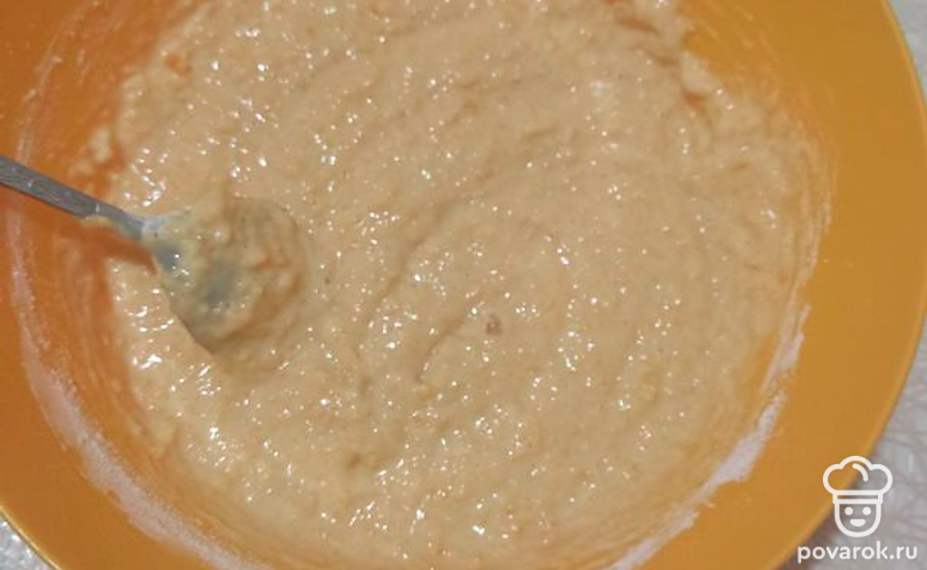 Все хорошо перемешаем и добавим муку с разрыхлителем. Сделаем тесто. Оно должно получиться не слишком жидким, но и не густым.