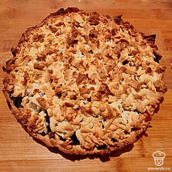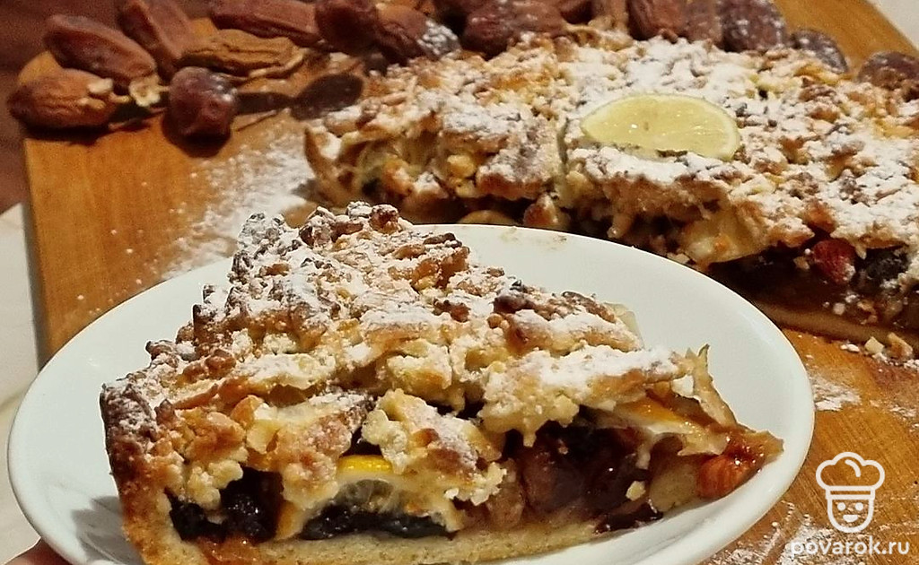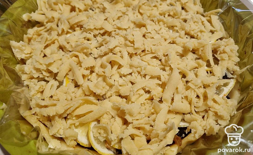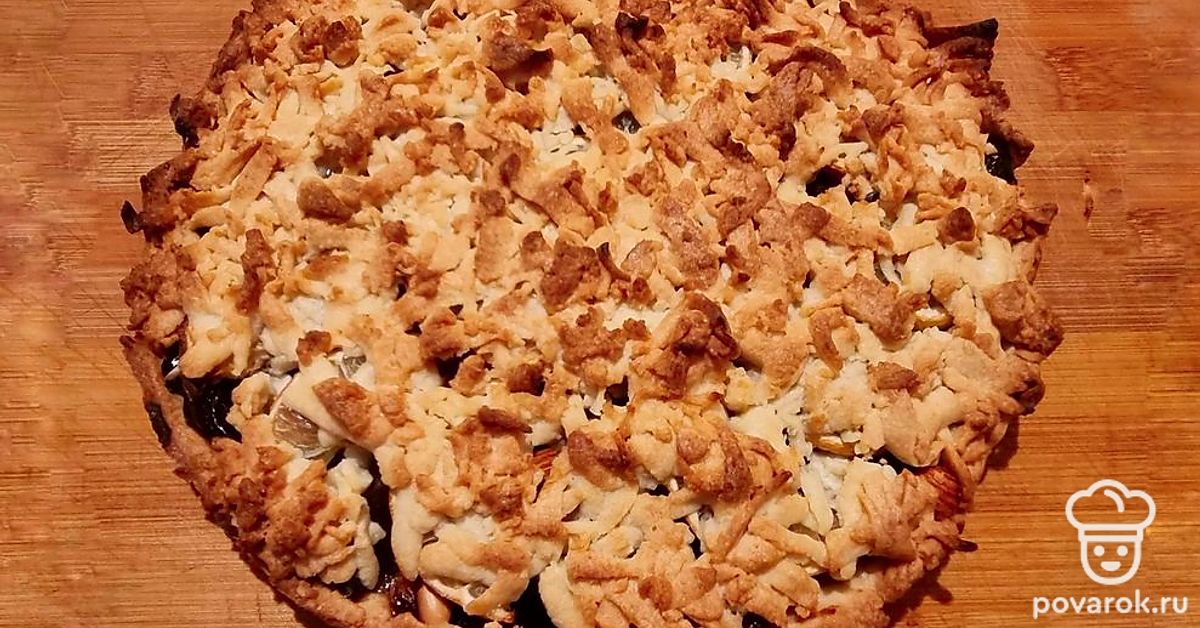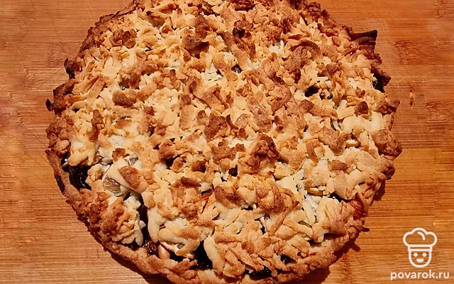 Достать вторую часть теста из морозилки, на крупной терке натереть верх будущего пирога. Духовку разогреть до 180 градусов, запекать пирог 30-40 минут до румяного цвета.