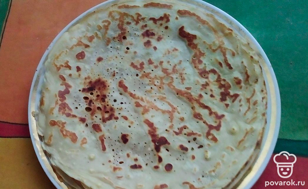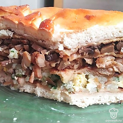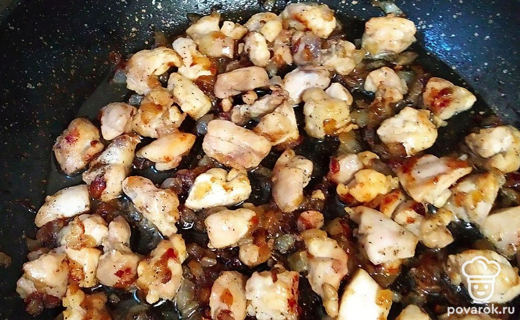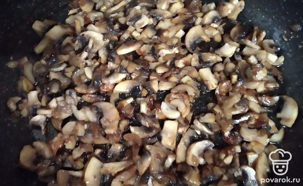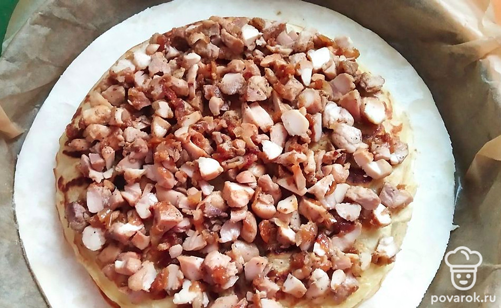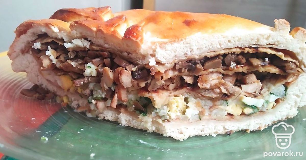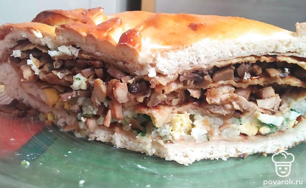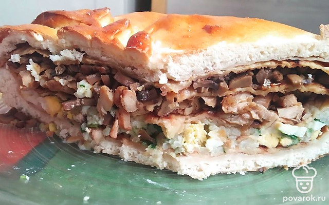 Положить следующий блин, на него куриную начинку. Следующий блин, на него грибы. Снова блин.