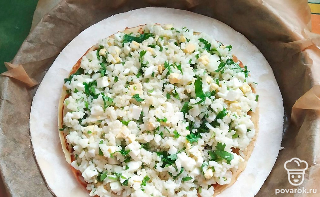 Форму застелить бумагой для выпечки. Смазать маслом и выложить корж слоеного теста диаметром больше блина. Сверху положить блин, на нем распределить рисовую начинку.