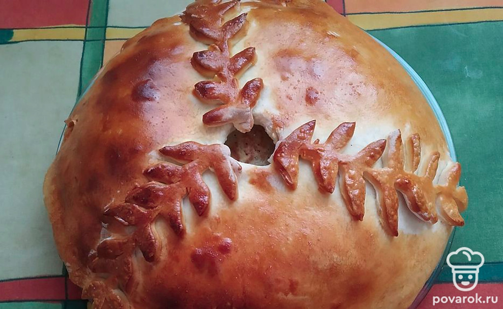 Верхний пласт теста должен быть диаметром больше нижнего на 1,5-2 сантиметра. Накрыть курник, защипнуть хорошо края внизу. Сверху оставить отверстие для выхода пара, смазать яйцом.