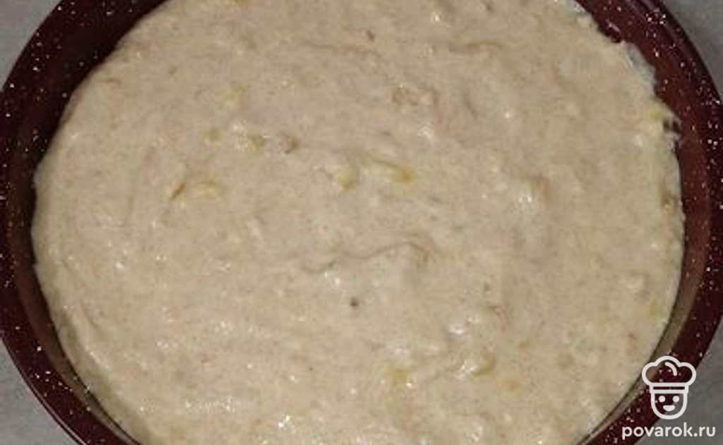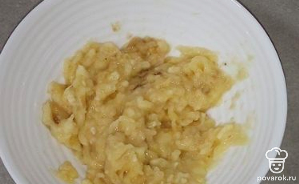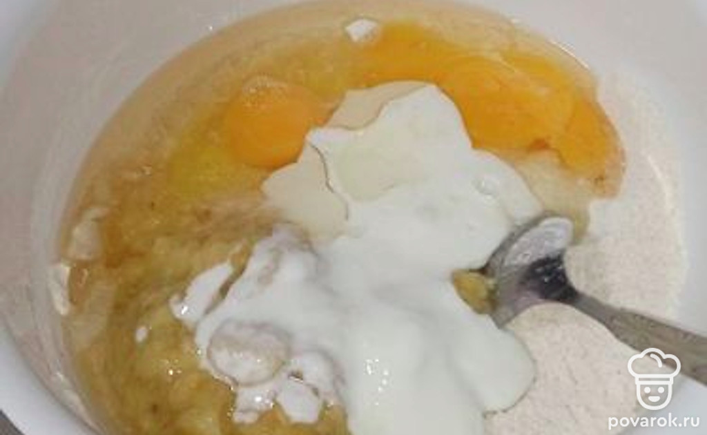 Добавить пюре из бананов, яйца, йогурт, масло и все быстро перемешать.