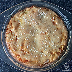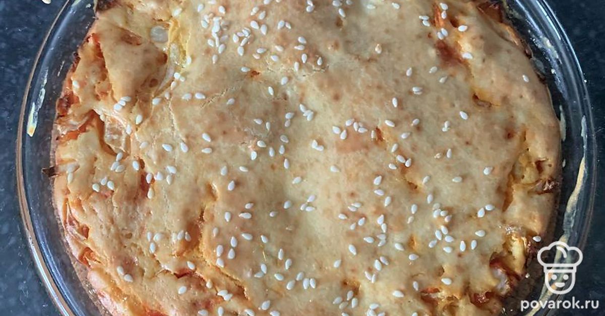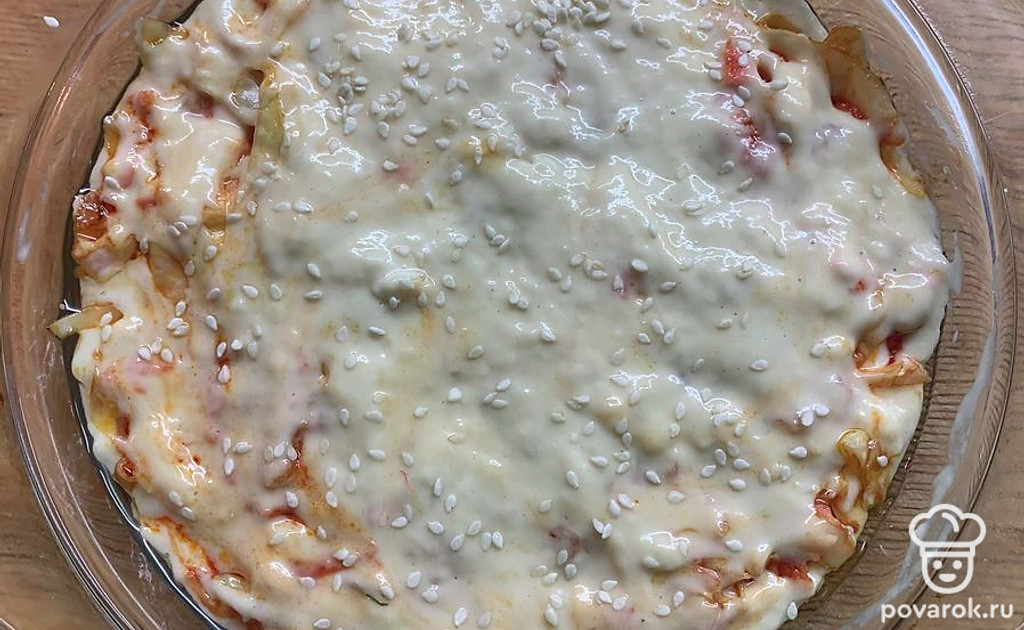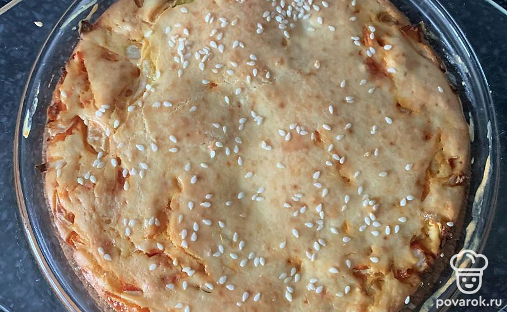 Накрыть остатками теста и посыпать кунжутом. Отправить в духовку на 35-40 минут при 180 градусах.