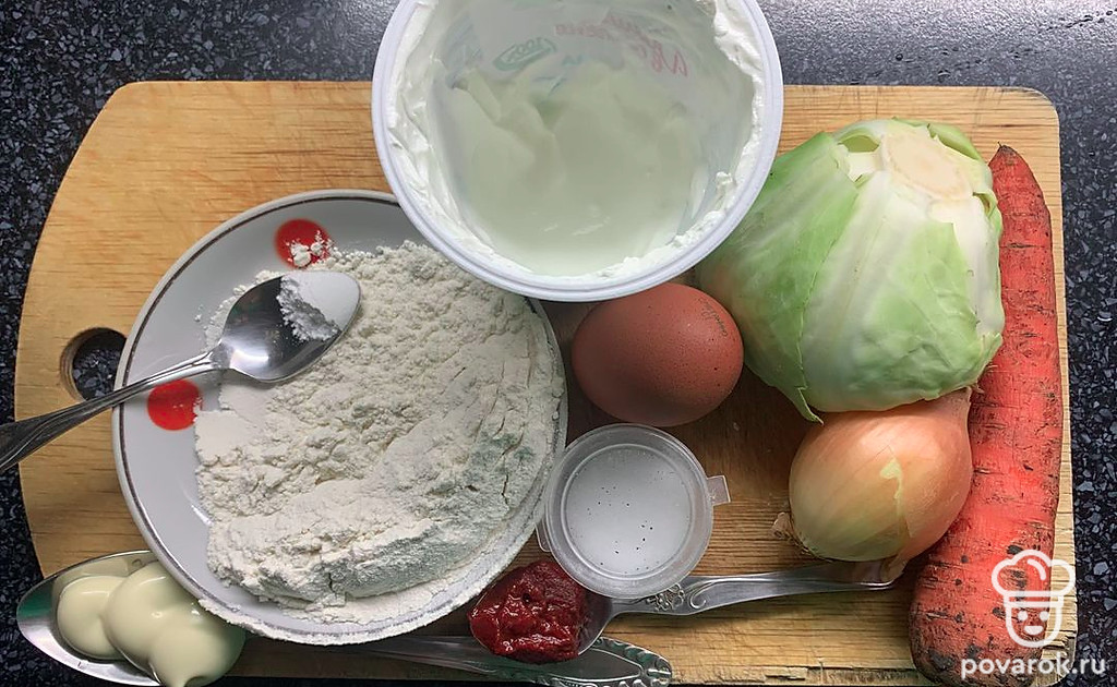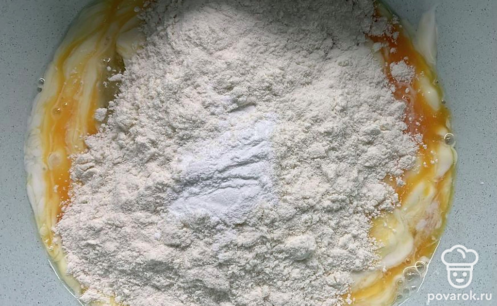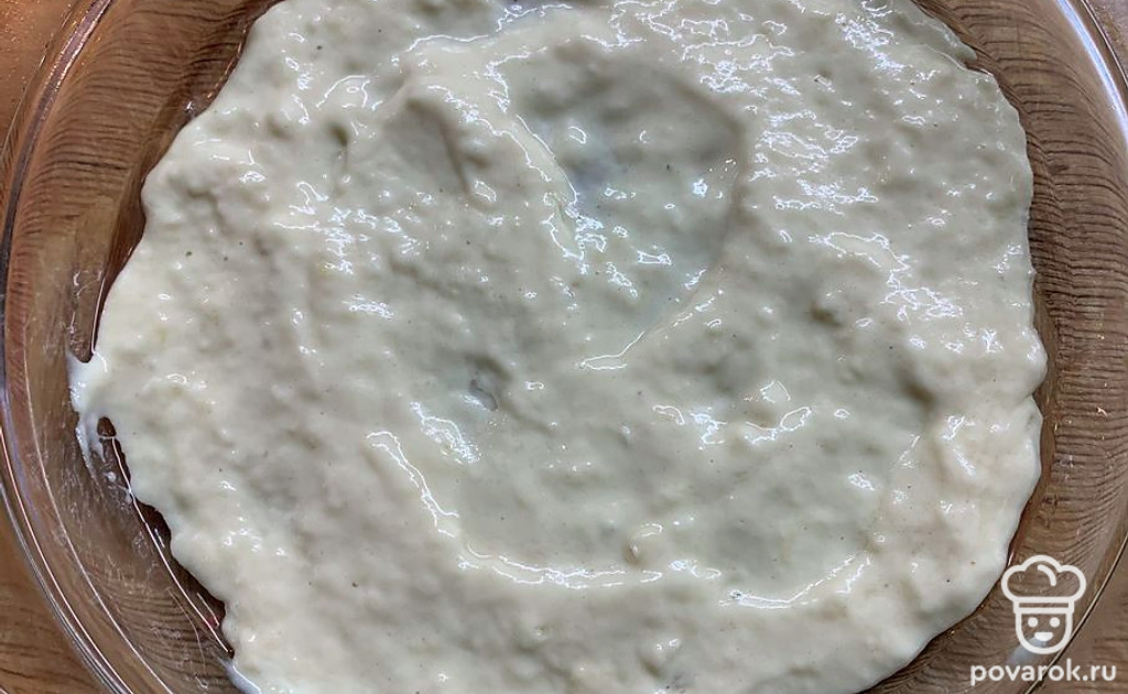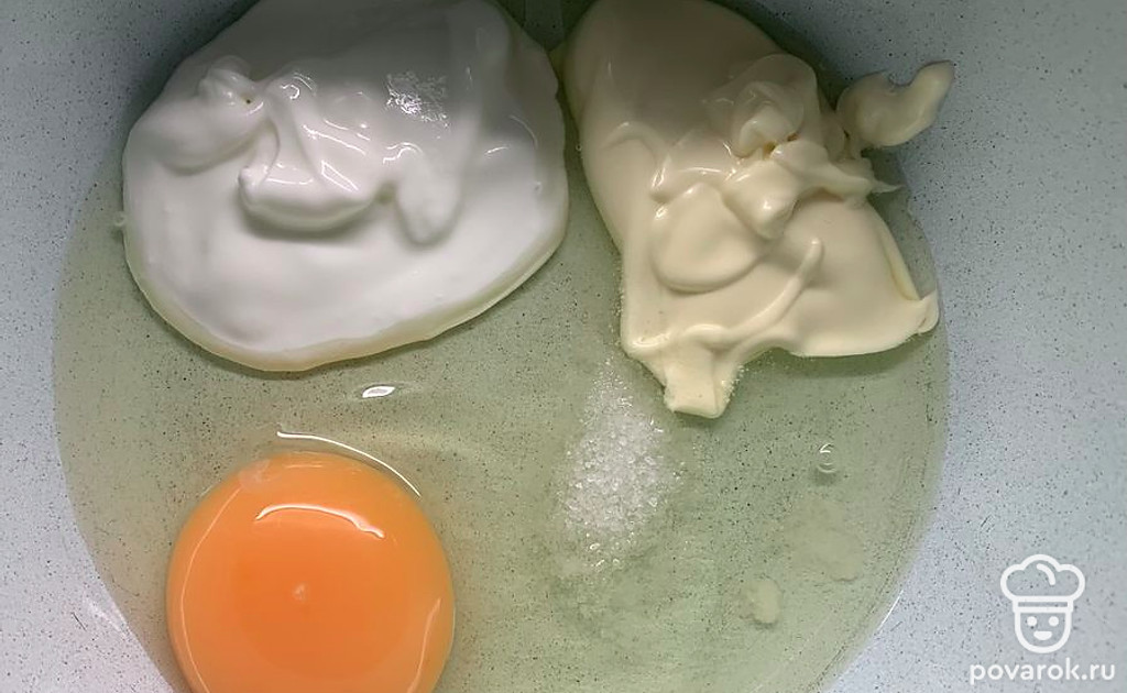Сделать тесто. Смешать сметану, майонез, яйцо и соль.