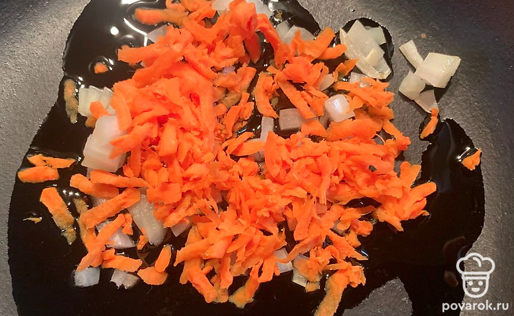 Лук нарезать на кусочки, морковь натереть на терке и обжарить на сковороде 3 минуты.