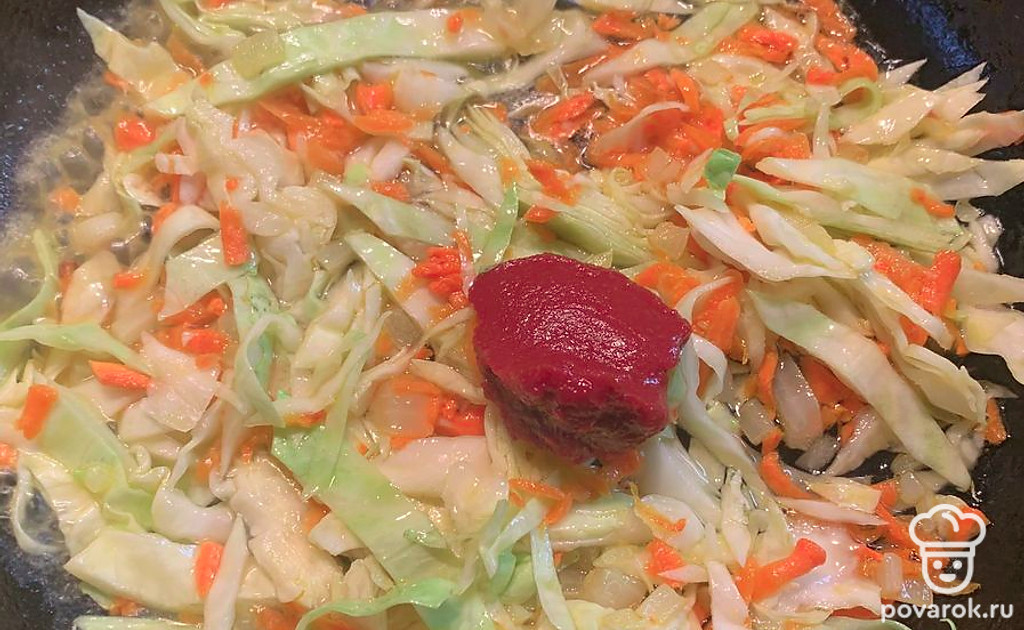 Добавить томатную пасту, соль и немного воды. Тушить до готовности.