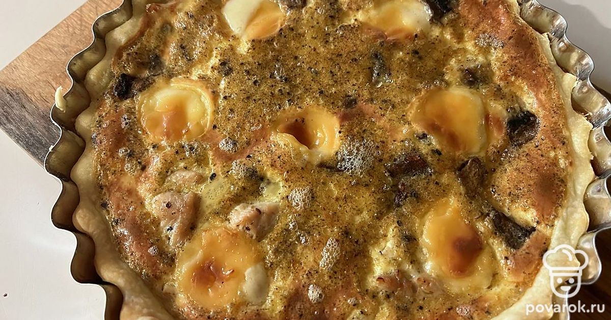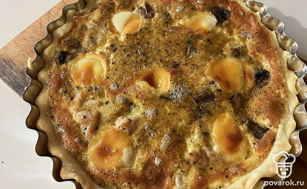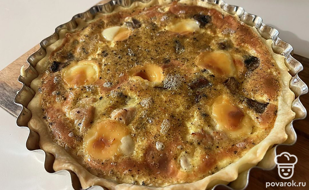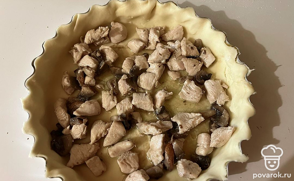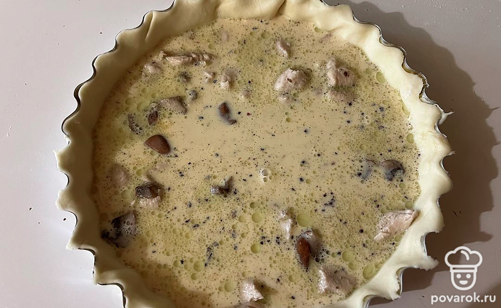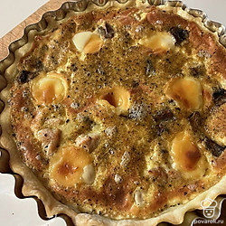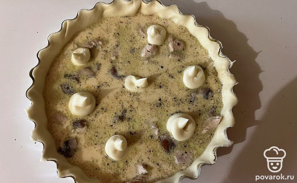 На поверхность киша при помощи кондитерского мешка высадите плавленый сыр. Отправьте киш выпекаться в духовку на 30 минут при 200 градусах.