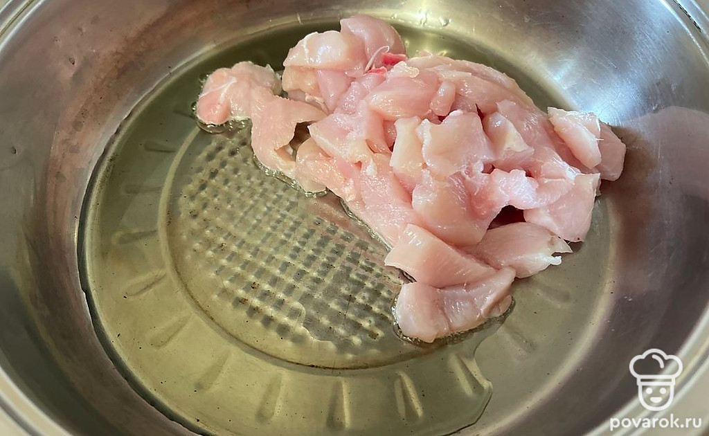 В сковороду влейте 15 грамм масла и поместите в нее грудку.