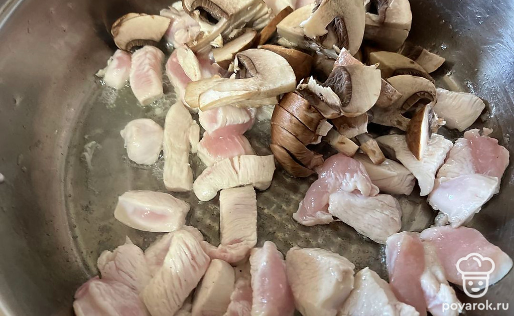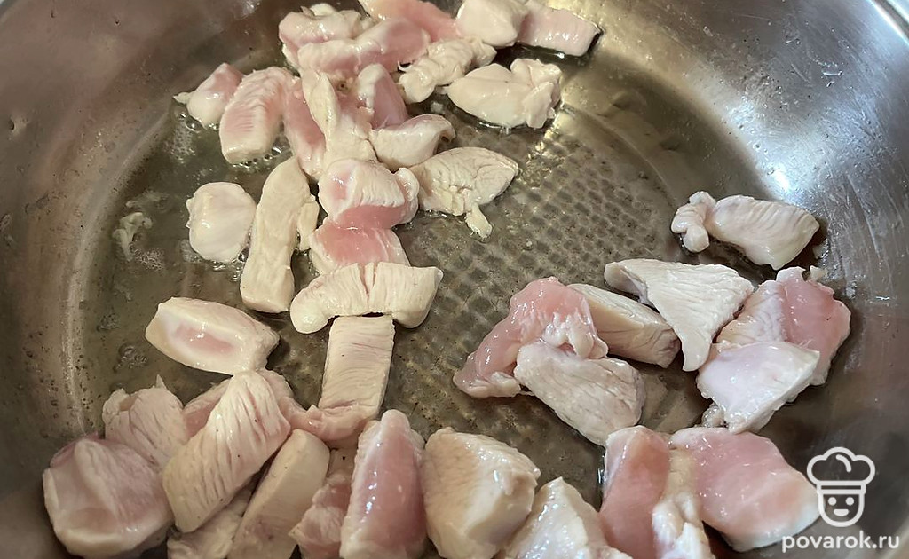 Обжарьте мясо, постоянно помешивая, в течение пяти минут.