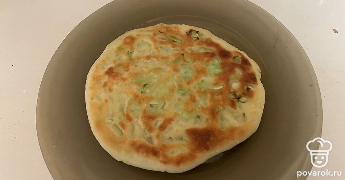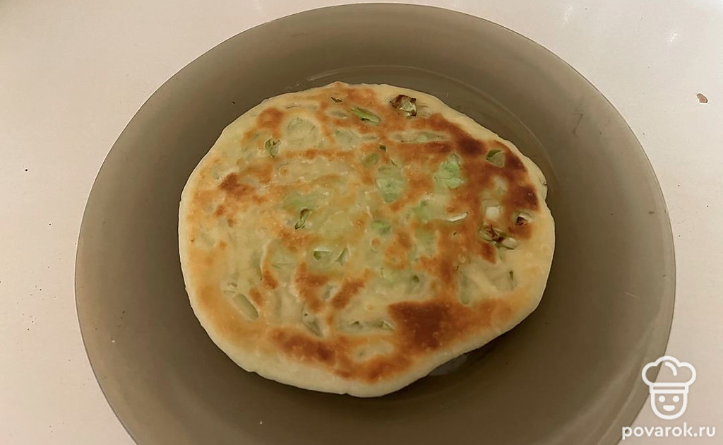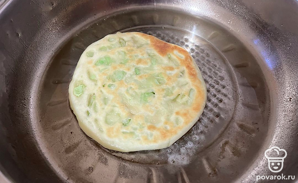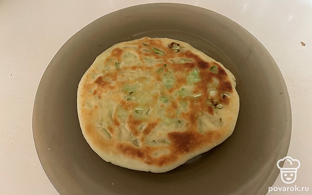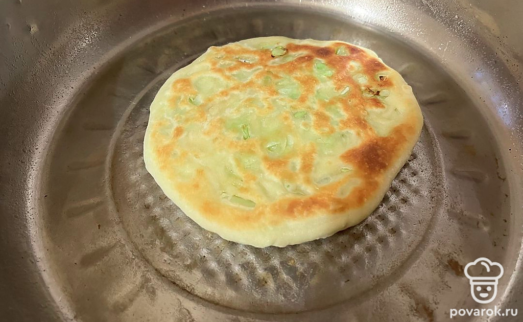 Каждую минуту переворачивайте лепешку с одной стороны на другую. В сумме пирог должен обжариваться 8 минут.