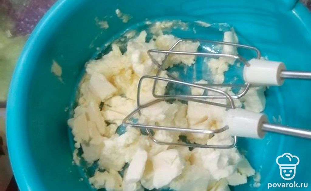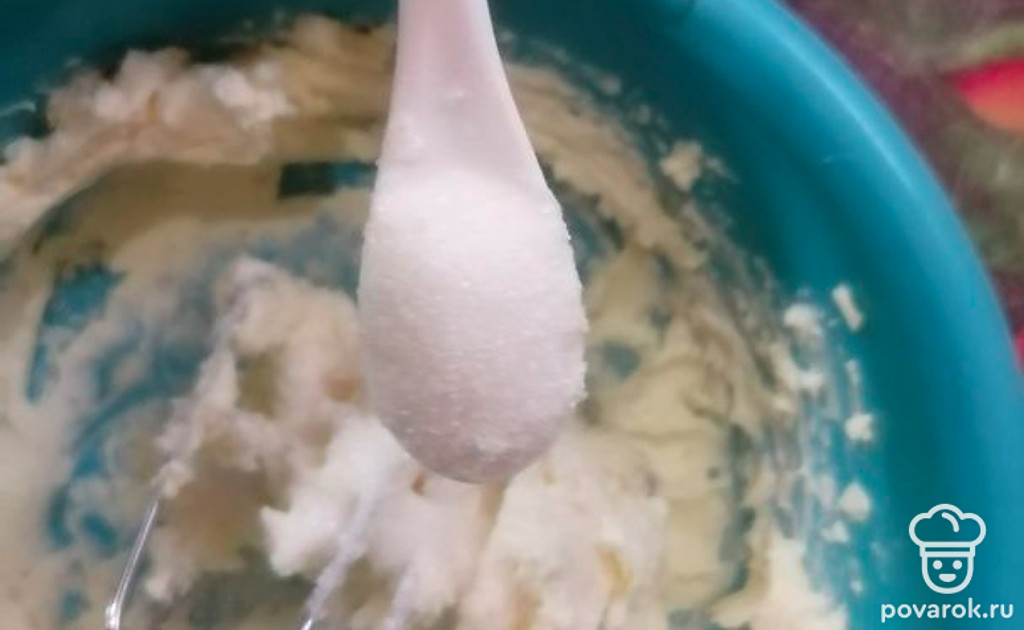 Добавляем чайную ложку сахара. Масло взбиваем с сахаром добела.