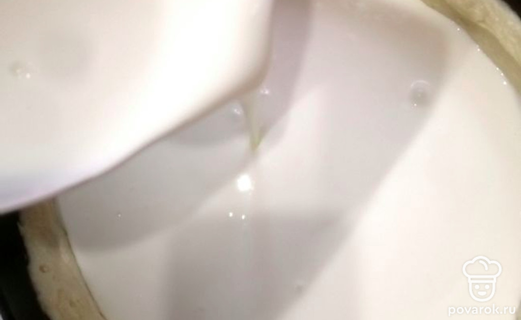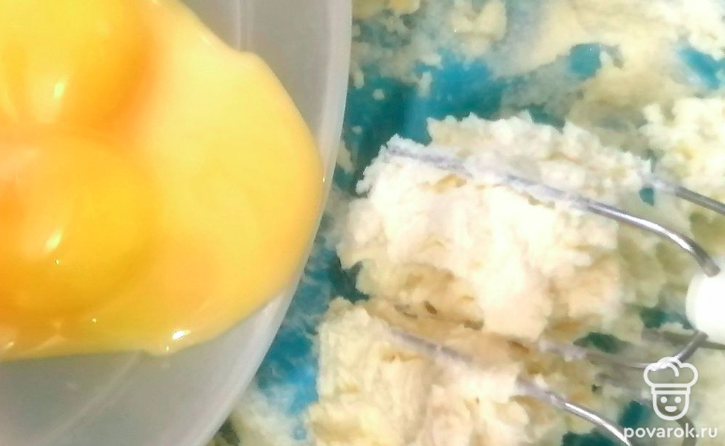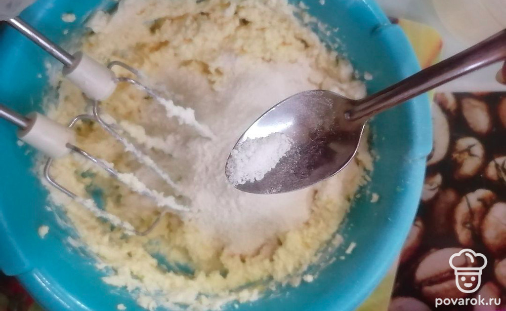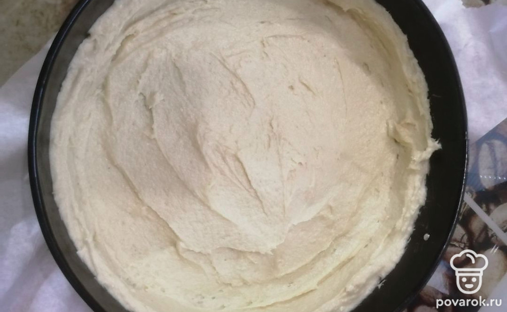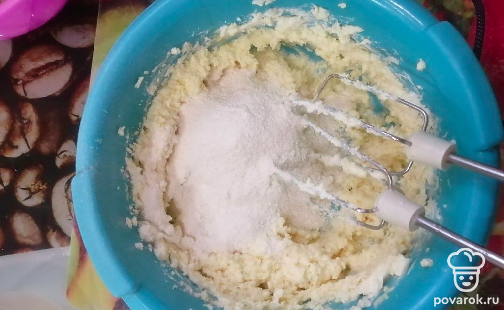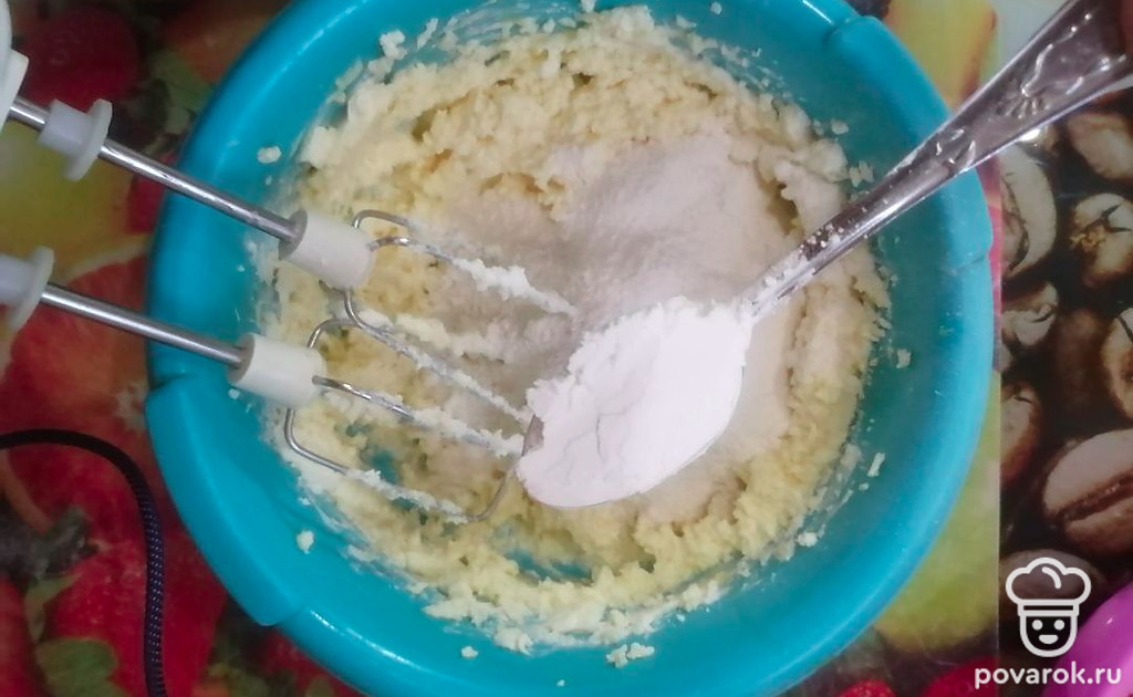 Всыпаем кукурузный крахмал. Все взбиваем миксером до однородной массы. Тесто получается жидким.