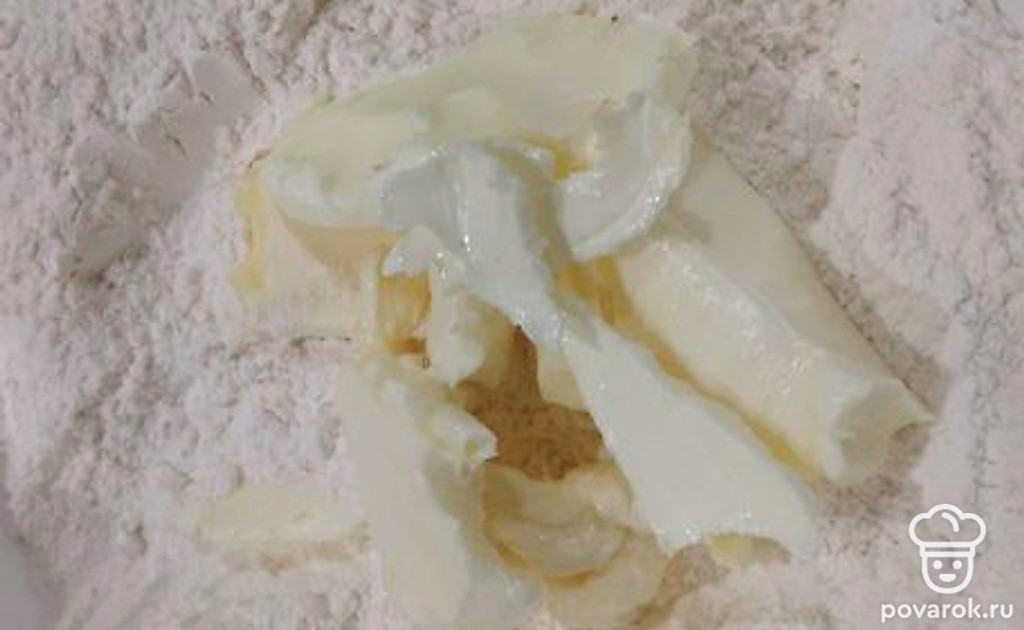 Насыпать в миску 250 грамм муки, выложить мягкое масло.