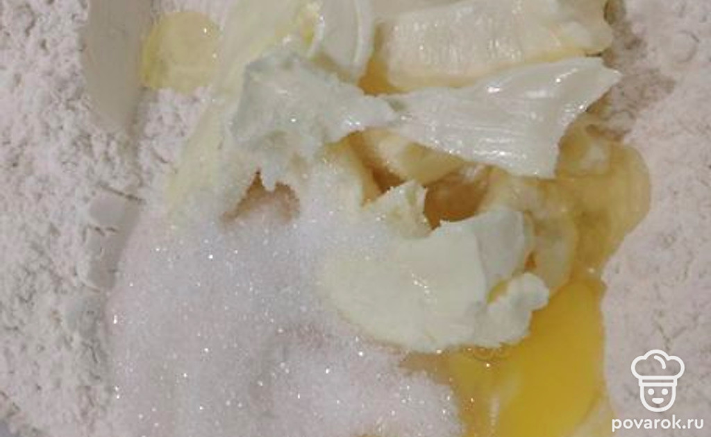 Подготовить начинку. Смешать 2 яйца, 100 грамм сахара, 3 столовые ложки муки, сметану, ванилин.